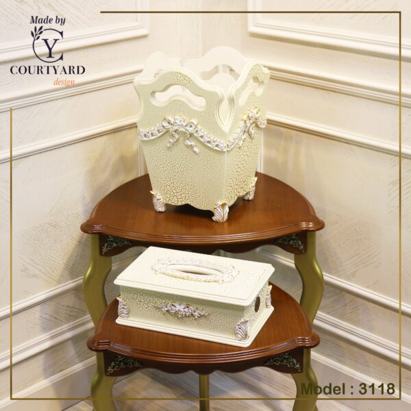 classic basket and tissue boxes made from wood covered with natural American oak veneer and decor flower