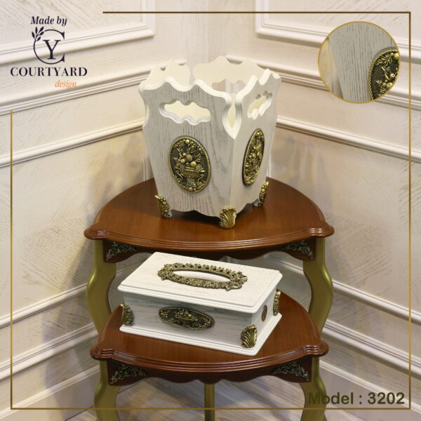 classic basket and tissue boxes made from wood covered with natural American oak veneer and decor flower